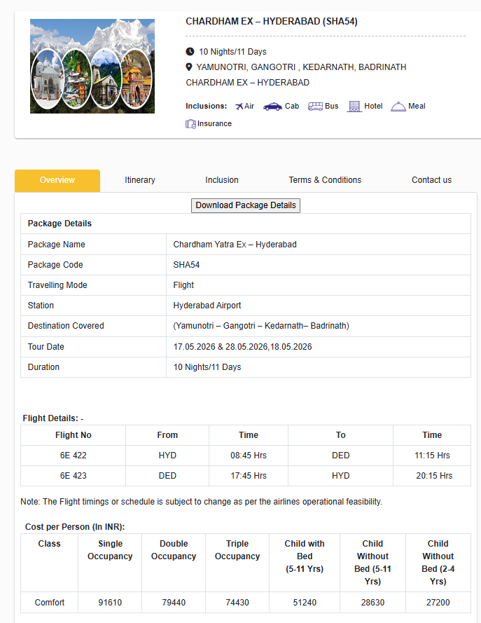 - ప్యాకేజీ పేరు: చార్ ధామ్ యాత్ర ఎక్స్-హైదరాబాద్ (SHA54)